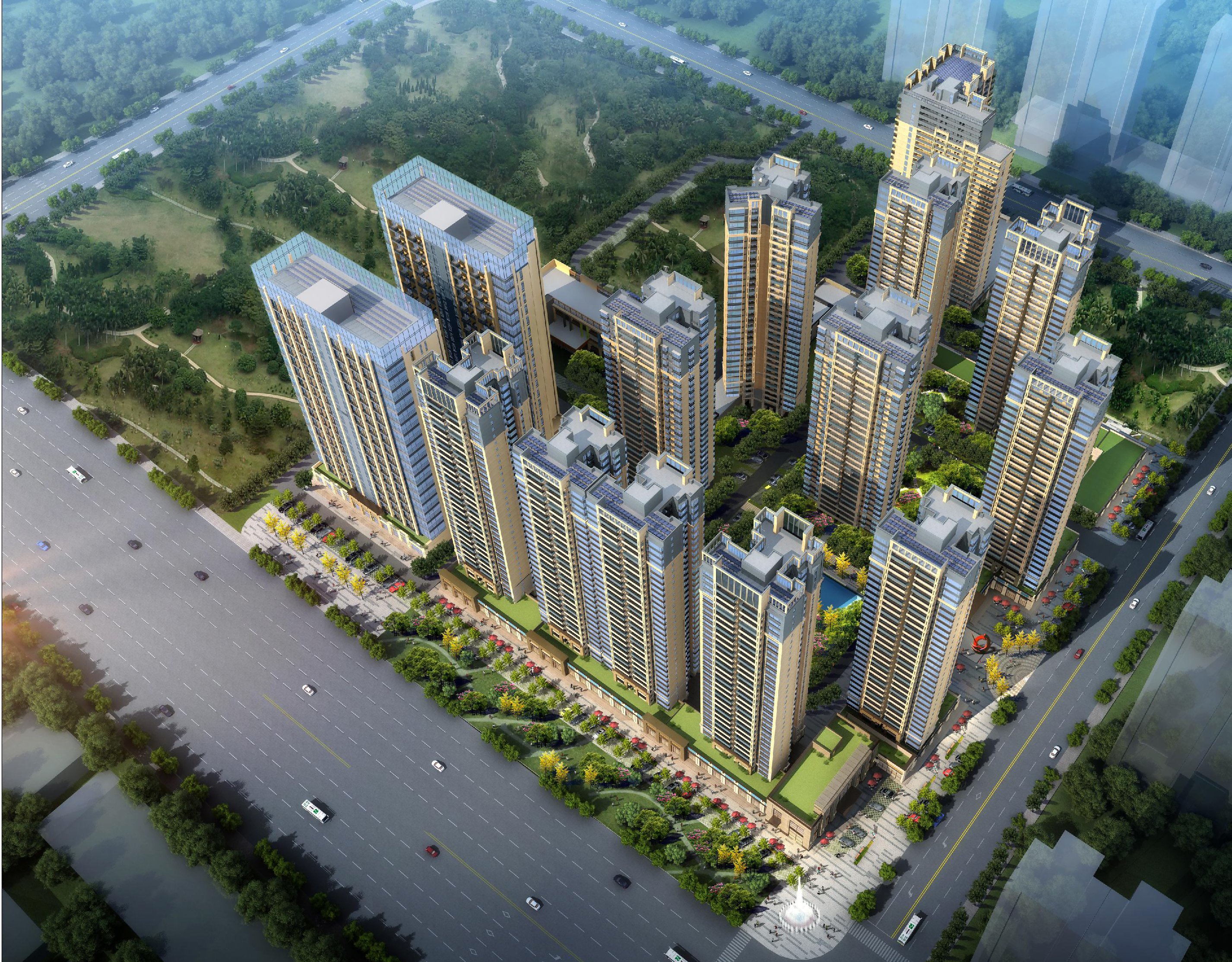 該項目布置為1棟29層、1棟30層、3棟31層、3棟32層、3棟33層住宅樓、2棟高層商業(yè)樓,建筑呈圍合式布置。